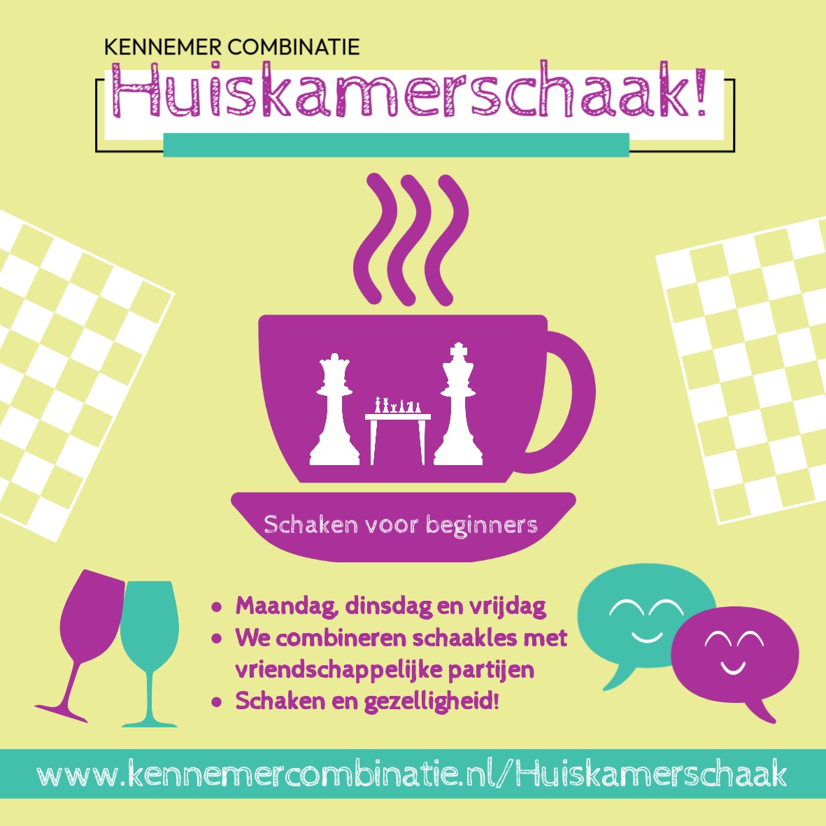 Bij KC krijgen niet alleen kinderen schaaktraining, ook volwassen schakers kunnen lessen volgen! Speciaal voor volwassen met weinig schaakervaring bieden wij namelijk Huiskamerschaak aan. Bij Huiskamerschaak draait het allemaal om in een ontspannen sfeer met elkaar te schaken. We starten altijd met een training van ongeveer een uur en spelen daarna vriendschappelijke partijen. Deelname is open voor iedereen! Bovendien kun je terecht op drie verschillende momenten in de week, namelijk op maandagavond, dinsdagmiddag en vrijdagavond.